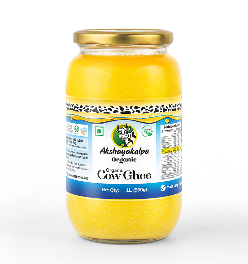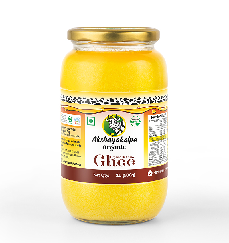Buy NowWhat makes Akshayakalpa Organic Desi Cow Ghee special? Akshayakalpa Organic Desi Cow Ghee is made from Akshayakalpa organic milk from desi cows, free from chemicals, synthetic hormones, antibiotics, and pesticides. Slowly churned using the traditional bilona method, it retains all its natural goodness, giving it a delicious taste. What are the health benefits? Akshayakalpa Organic Cow Ghee, made from organic milk free of chemicals, synthetic hormones, antibiotics, and pesticides, is slowly churned using the traditional bilona method to retain its natural goodness and delicious taste. Rich in vitamins A, D, E, and K, this ghee supports overall health, provides a great source of energy, maintains gut health, and improves heart health. Ghee is also known to reduce bad cholesterol and increase good cholesterol. Perfect for bringing out the flavor and nutrition of your dishes, it's ideal for drizzling over rotis, adding to dal, sautéing vegetables, baking, frying, and even as a popcorn topping. Ideal for- Perfect for those who grew up enjoying desi ghee, passed down through generations, and want to give the same pure, nutritious ghee to their children.Price (Including GST)