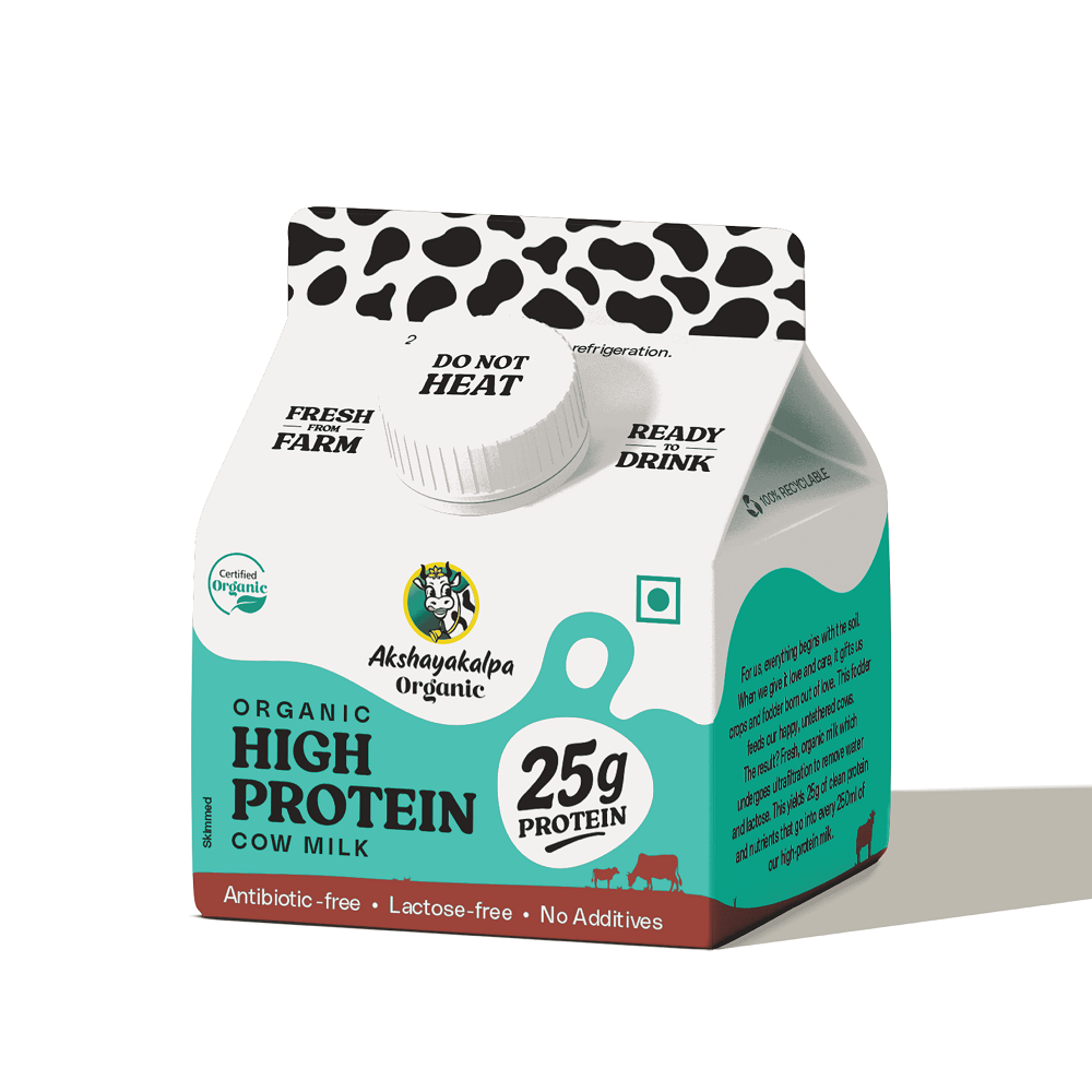 Akshayakalpa High Protein Organic Cow Milk gives you 25g of clean protein in every 250ml. Fresh, ultrafiltered and ready to drink, it needs no boiling. With the right balance of whey for quick energy and casein for steady strength, it powers you through the day. Low-fat, lactose-free and gut-friendly, with no added sugar, flavours or stabilisers. Enjoy chilled on its own or in smoothies, shakes, chia bowls and cold coffee.