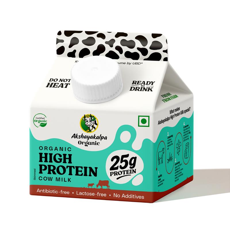 Akshayakalpa High Protein Organic Cow Milk gives you 25g of clean protein in every 250ml. Fresh, ultrafiltered and ready to drink, it needs no boiling. With the right balance of whey for quick energy and casein for steady strength, it powers you through the day. Low-fat, lactose-free and gut-friendly, with no added sugar, flavours or stabilisers. Enjoy chilled on its own or in smoothies, shakes, chia bowls and cold coffee.