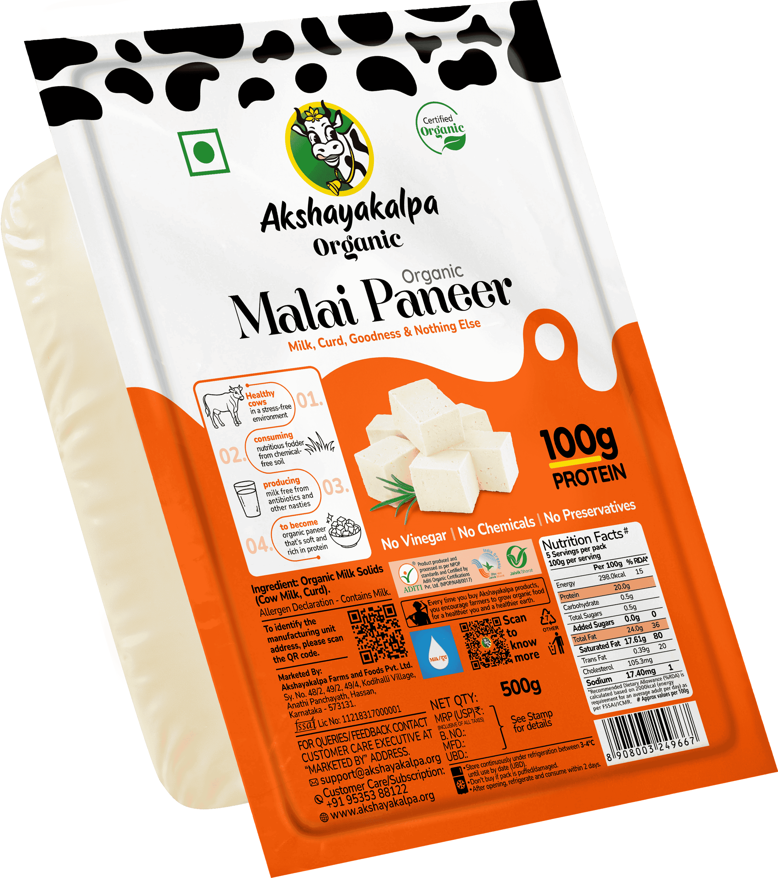 Akshayakalpa Organic Malai paneer is handcrafted using 100% organic milk from free-roaming, organic-fodder fed cows. Traditionally prepared by adding organic curd- without addition of synthetic citric acid, tartaric acid or lime juice- it has no additives, preservatives or emulsifiers. A careful preparation process ensures that our malai paneer boasts of authentic home-made flavour and a melt-in-the-mouth soft texture, making it a versatile and ever-loved ingredient in most Indian cuisines. From a classic curry, delicious starters or even mouthwatering desserts, its subtle, milky flavor complements both traditional and innovative fusion dishes.